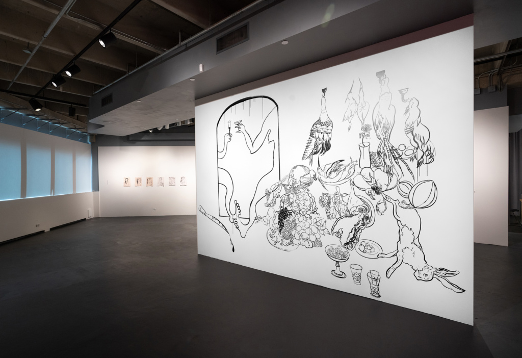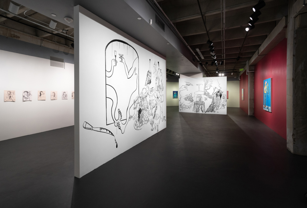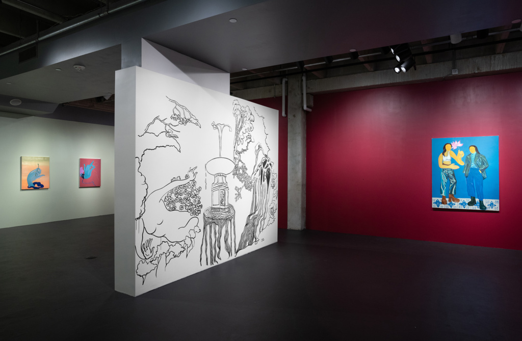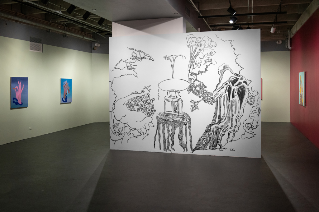 The imagery that resulted from Qin’s exploration yielded works encoded with blended iconography, utilizing both Eastern and Western symbolism and contemporary and historical frameworks. Although the work is influenced by Chinese history, the facial features, hand gestures, and objects held by figures in her work only vaguely imply a period before the current time. References to the history of painting in the West and movements such as Surrealism, Romanticism, Expressionism, and Mannerism coexist with elements gleaned from our current period’s visual culture found in cartoons, illustration, film, advertising, and the internet. Qin also borrows and elevates imagery from her own life.