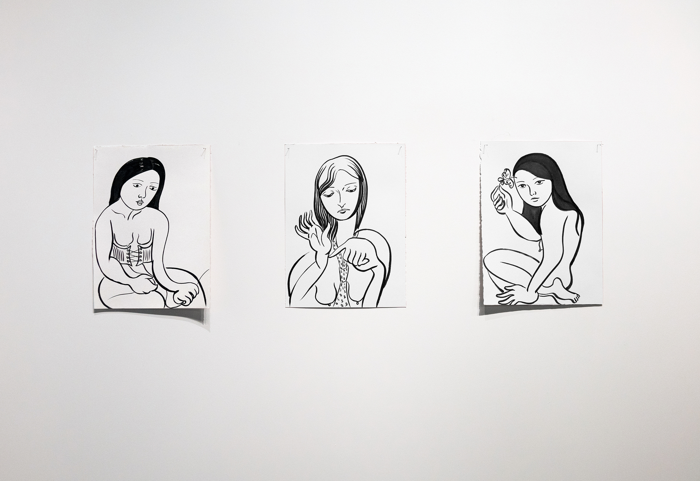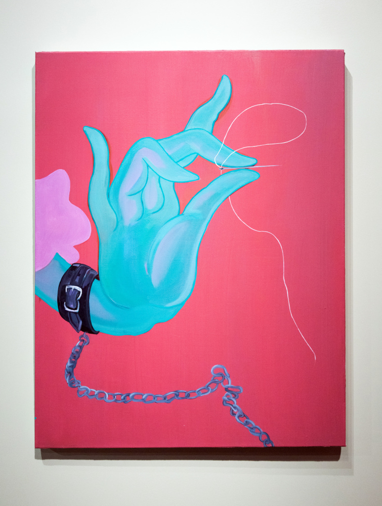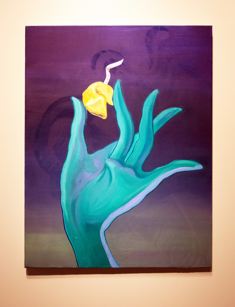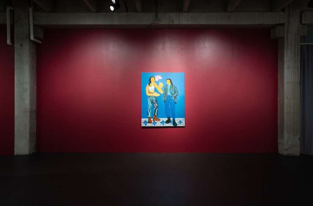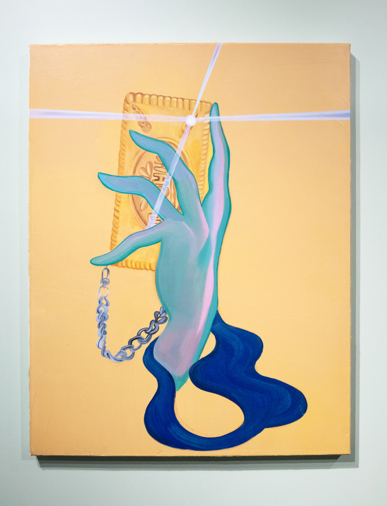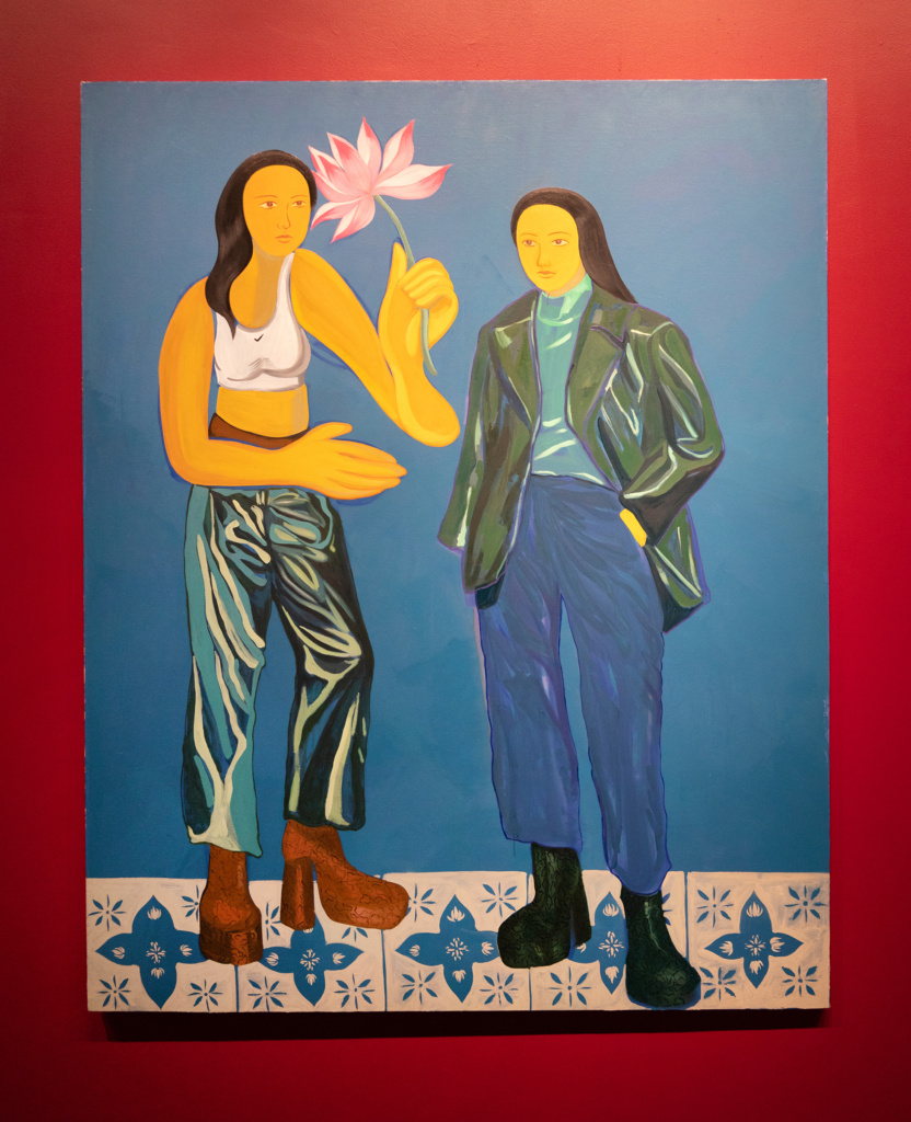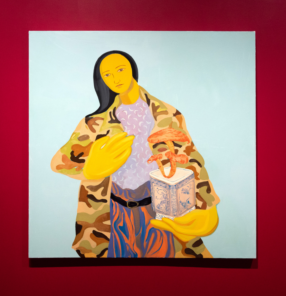 In some instances, figures pose with conspicuous intentionality, recalling the calculated poses, product placements, and constructed identities presented on social media. Qin’s careful arrangements of her subjects serves as a metaphor for contemporary corporal experiences. Their stylized and deliberate rendering also alludes to the idealized lifestyles of influencers and social media celebrities, which in Qin’s work present almost as religious figures. Everyday objects like hair scrunchies, Cheetos, and smartphones become symbols embedded with marked significance, depicted with devotional reverence. In both subject and form, Qin’s work alludes to the combination of an ambiguous past and present.