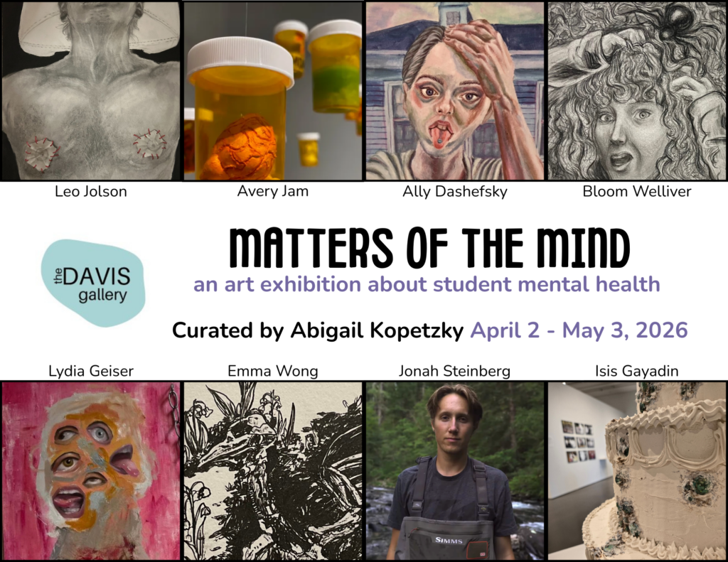 The Davis Gallery will feature Matters of the Mind, an exhibition featuring artwork by students that engages with mental health. Curated by Abigail Kopetzky (MA ’26)