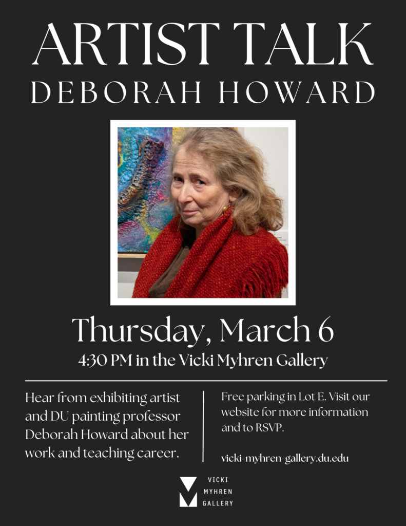 Please join the Vicki Myhren Gallery for an artist talk by renowned artist and DU painting professor Deborah Howard. Deborah’s artwork is currently on view at the VMG in her show Echoes.