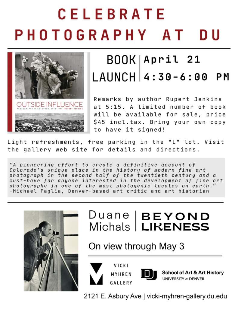 We are thrilled to host the book launch for Rupert Jenkins’ Outside Influence: Photography in Colorado, 1945-1995. In spring 2025, the VMG was pleased to feature an exhibition of the same name related to this incredible publication.