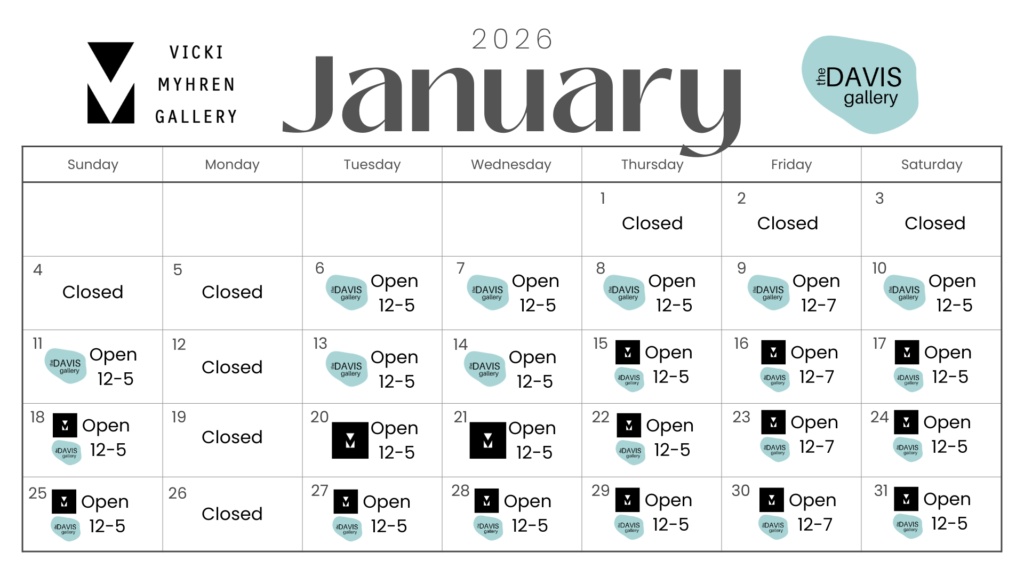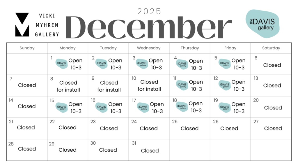 From November 24 through December 23, the Davis Gallery will be open 10 AM to 3 PM, Monday through Friday. We are also available by appointment.